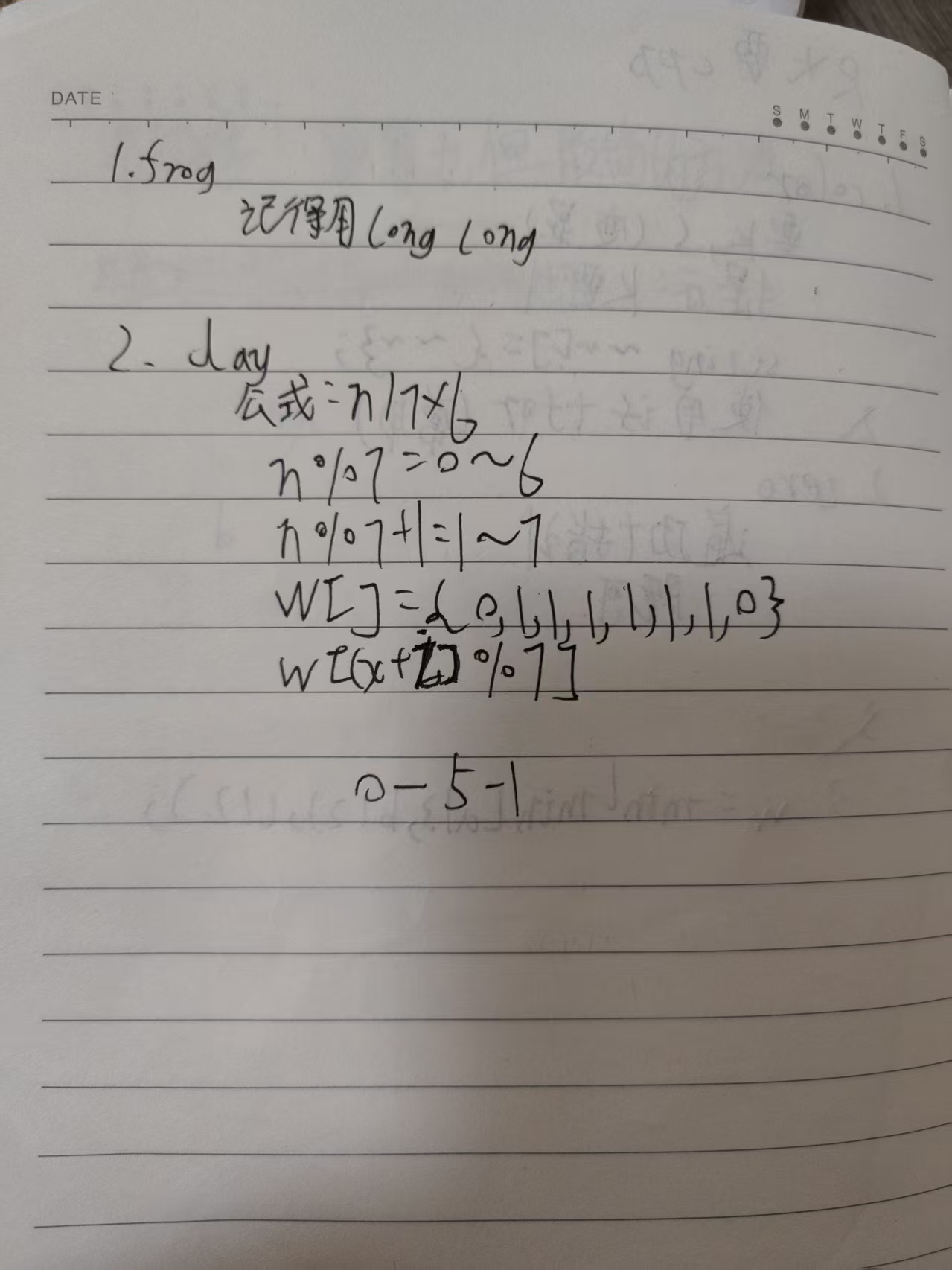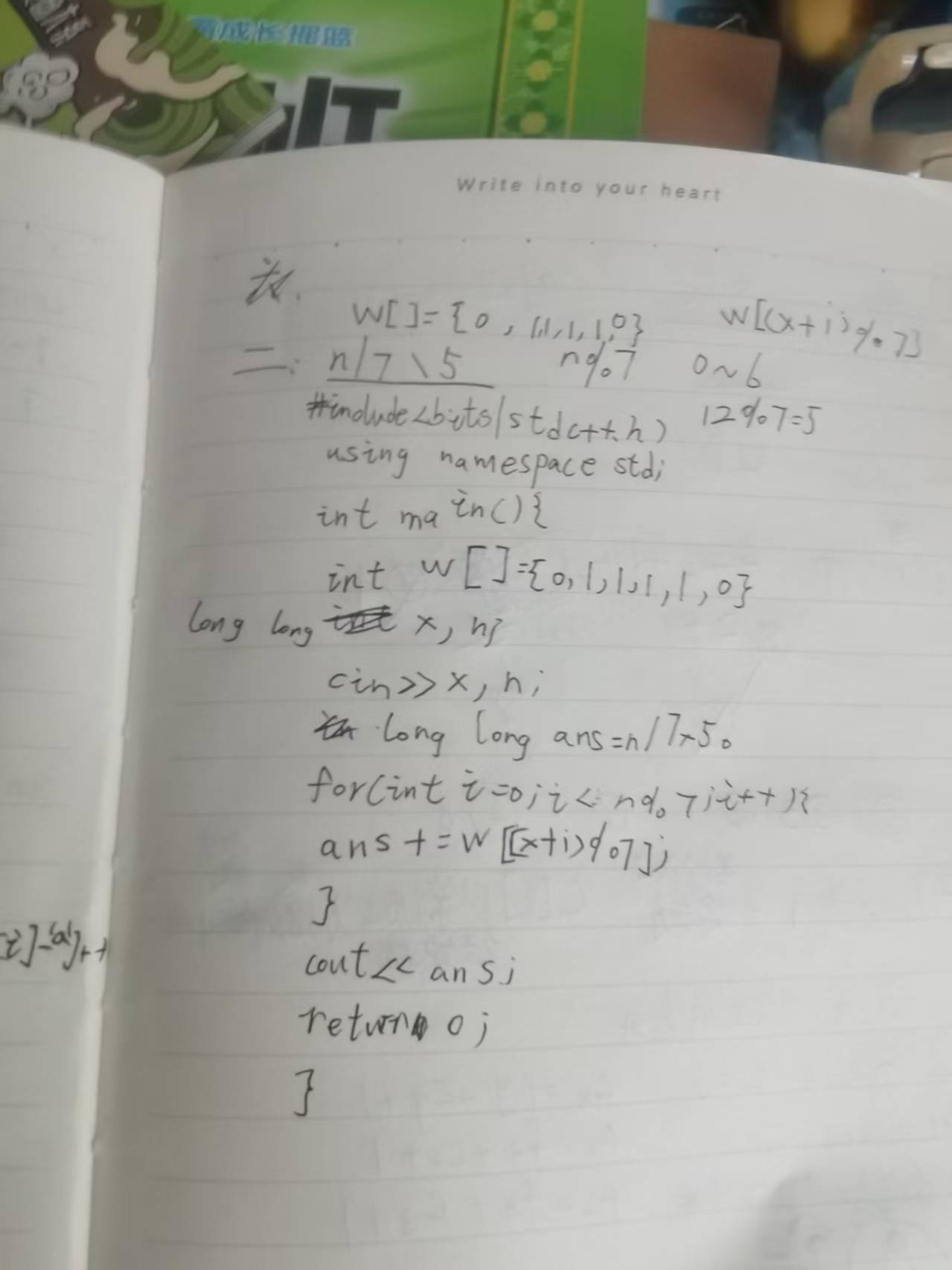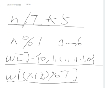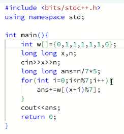 可以定义一个记录总工作日变量(ans),先用公式ans=n/7*5算出整周的工作日,然后定义一个储存周1到周6的数组(w)。遍历从1到n%7-1(因为它的日期是从第一天开始算的所以日期肯定是前一天),每次ans都+w[(x+i)%7 ](从初始日期加已过天数%7得出0-6范围内的日期)。最后输出ans就可以了。