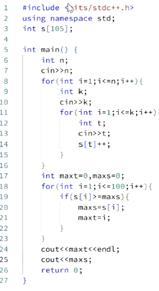 这一题我们可以把要对比的特征值想成找出现次数最多的最大数。可以用一个数组记录出现次数(s[105]),再用一个for循环从1到100,同时还要定义两个变量,一个用来放最大次数(maxs),一个用来放现次数最多的最大数(maxt)。每次循环如果maxs<=s[i],就要把maxs=s[i],maxt=i。因为是从小到大,所以最后得出的数一定是最大的。最后输出maxt和maxs就可以了。